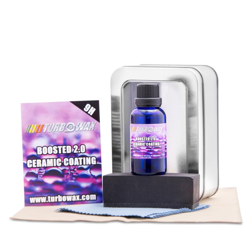 Turbo Wax BOOSTED 2.0 Exterior Ceramic Coating produces a protective barrier to the surface. Can be applied to paint, wheels, exterior trim and glass (excluding windshield) Turbo Wax BOOSTED 2.0 Ceramic Coating creates a long term surface protection along with superior shine.